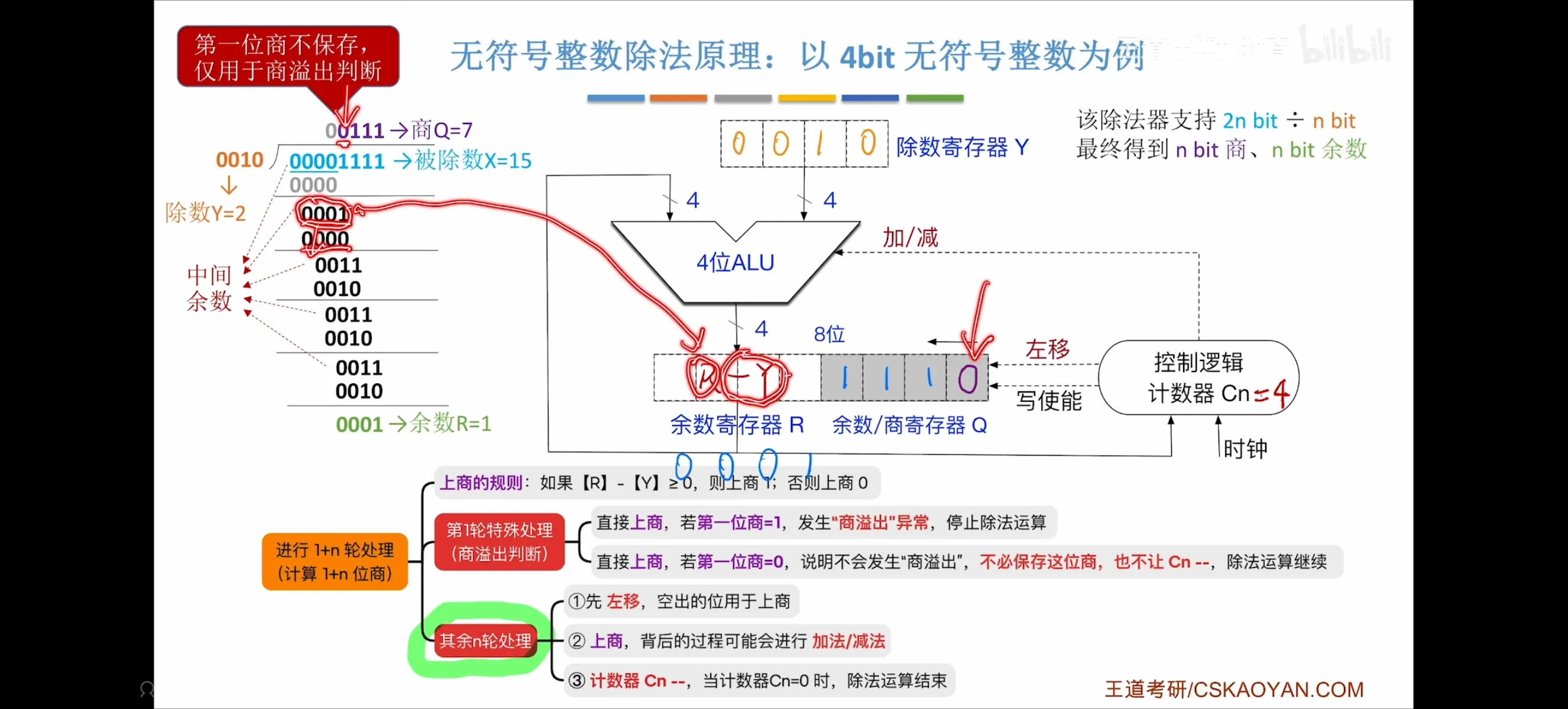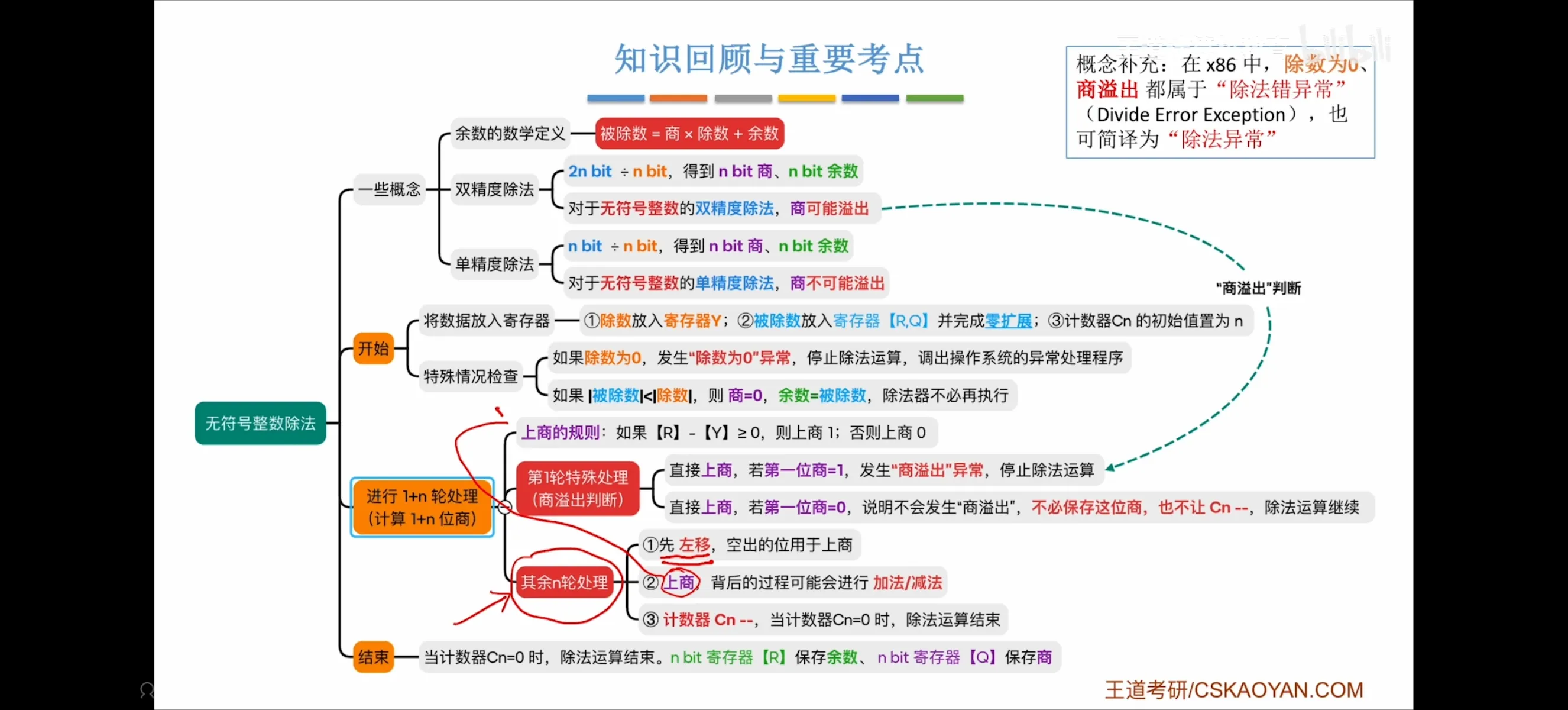 为避免算到最后才发现溢出,机器在正式移位前会做“第 1 轮检查”: 取被除数最高 位与除数比较。只要满足 (表示首轮就能减),就说明后续商位数会超过 Q 寄存器,机器立即抛出商溢出异常。